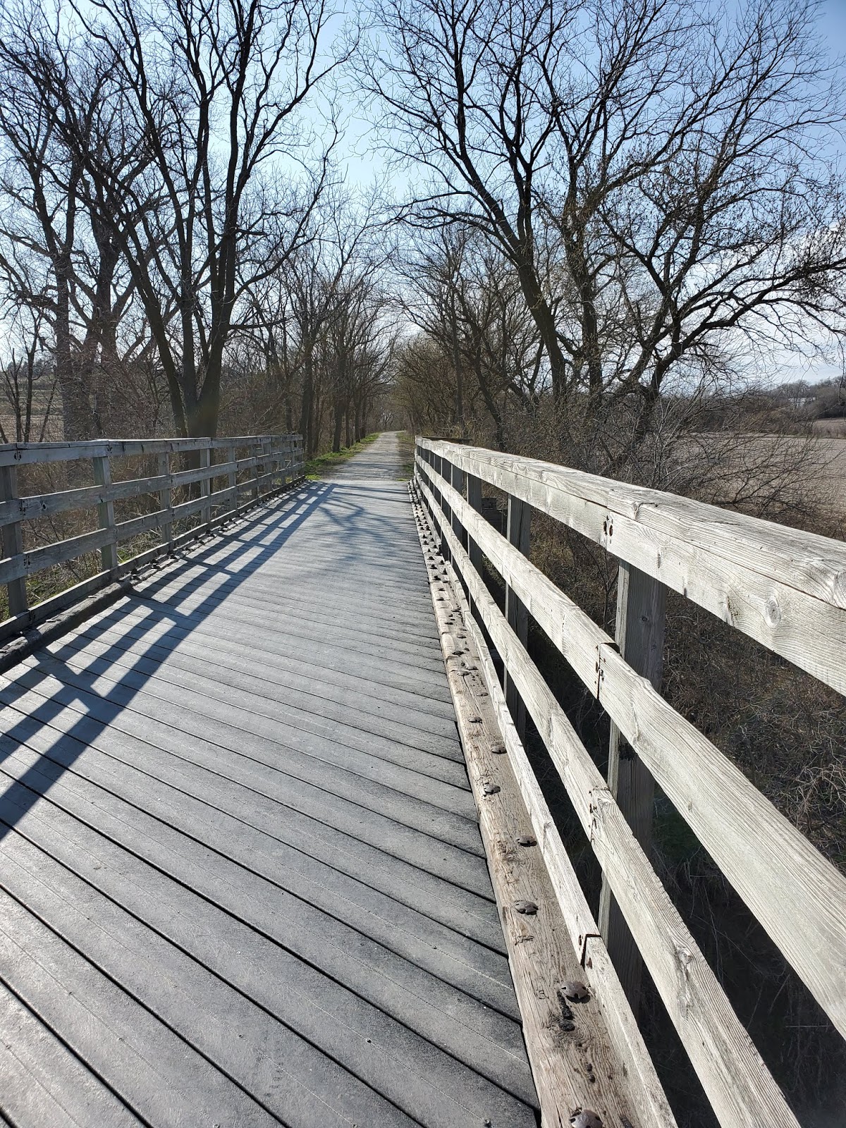 I stopped for a short break just before the trestle. My right knee wasn't too happy, I tried to stretch it out a little. Shortly after we'd crossed this bridge, we came to a small gravel road crossing, where a car was parked off to the side. Two ladies were standing about 500 ft. from the vehicle, looking down the trail. One was ever